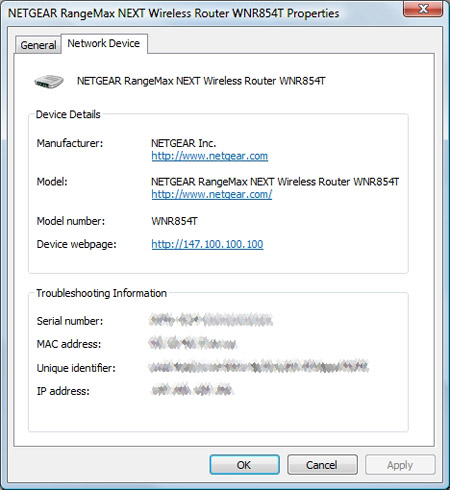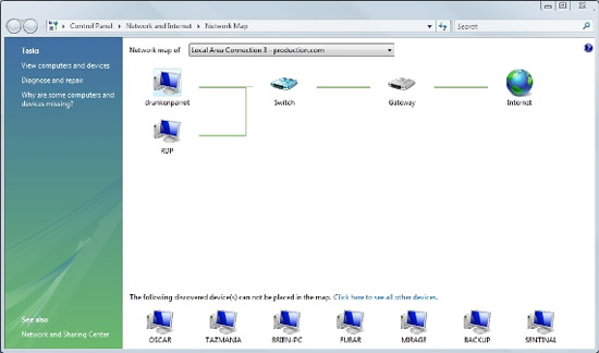 Nếu đưa chuột qua các thiết bị trên sơ đồ mạng, Vista sẽ hiển thị một số thông tin cơ bản về thiết bị đó. Thông tin này sẽ khác nhau phụ thuộc vào kiểu thiết bị và tính năng của nó. Ví dụ, nếu tôi đưa chuột qua một switch, thì Windows sẽ chỉ cho tôi thấy tên đượg gán cho switch đó. Nếu tôi thực hiện như vậy với gateway, thì Windows sẽ cho thấy thông tin như địa chỉ IP của gateway và địa chỉ MAC.