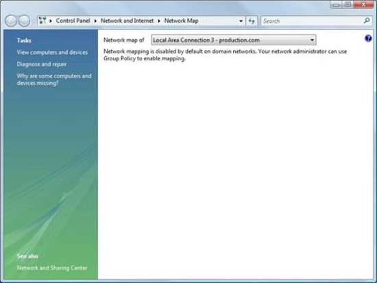 Nếu quan sát ở hình trên thì bạn sẽ thấy được rằng, ở góc trên bên trái của cửa sổ có một liên kết mà bạn có thể sử dụng để quan sát sơ đồ mạng đầy đủ. Nếu kích vào liên kết này, bạn sẽ gặp một thông báo cho biết rằng việc sơ đồ hóa mạng đã bị vô hiệu hóa mặc định trên các mạng miền, xem hình B. Thông báo này tiếp tục cho biết rằng quản trị viên mạng của bạn có thể sử dụng Group Policy để kích hoạt việc sơ đồ hóa. Bạn vẫn sẽ gặp thông báo này dù được đăng nhập như một quản trị viên.