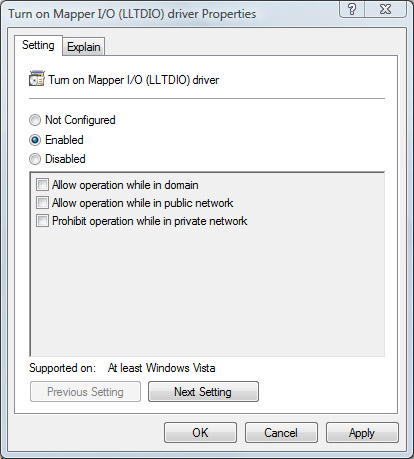 Để kích hoạt sơ đồ hóa mạng, bạn phải kích hoạt thiết lập Turn On Mapper I/O (LLTDIO) Driver. Như bạn thấy trong hình, không đơn giản chỉ việc kích hoạt thiết lập mà bạn phải sử dụng các hộp kiểm của màn hình để xác định các tình huống nào bạn muốn cho phép hoạt động. Mặc định nó được kích hoạt đối với mạng riêng.